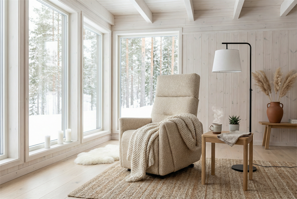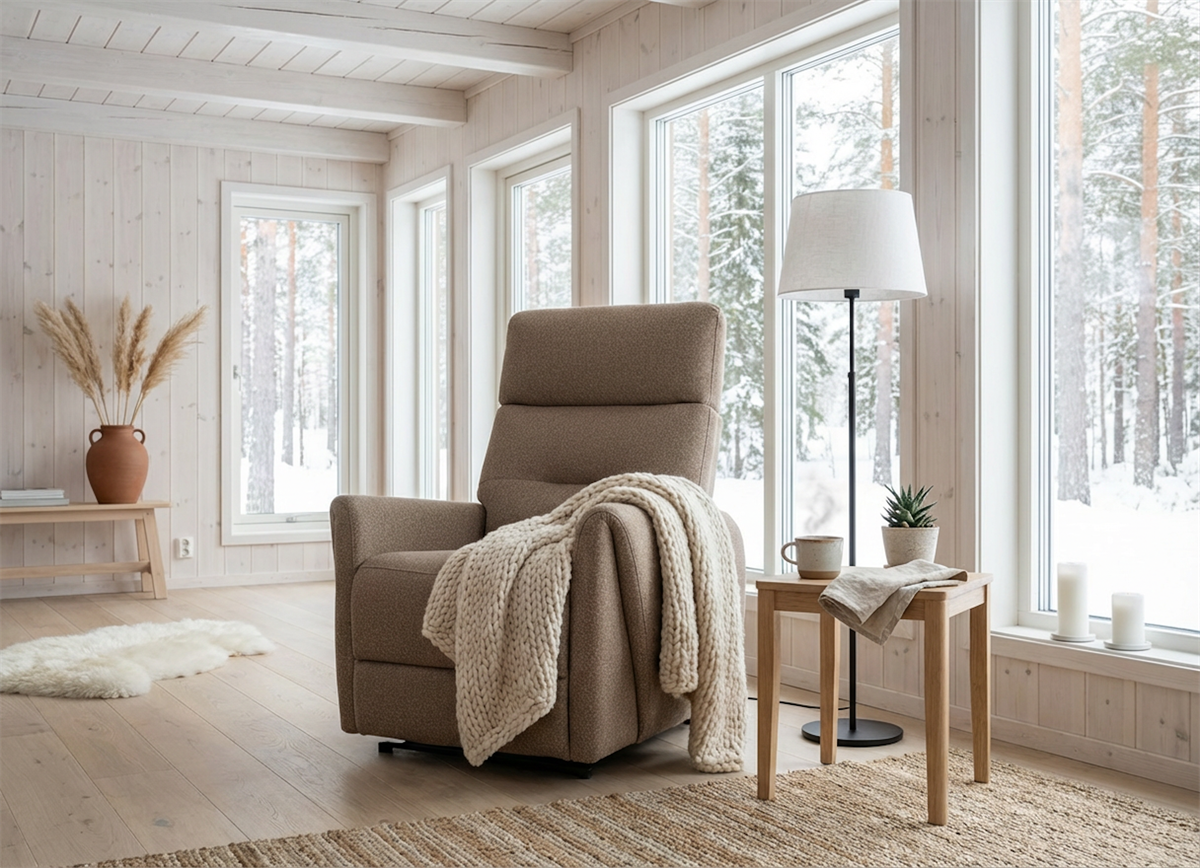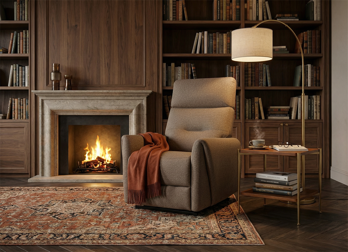 Cette option est particulièrement adaptée lorsque le fauteuil se trouve au milieu d’une pièce sans prise à proximité ou pour un fauteuil pivotant.