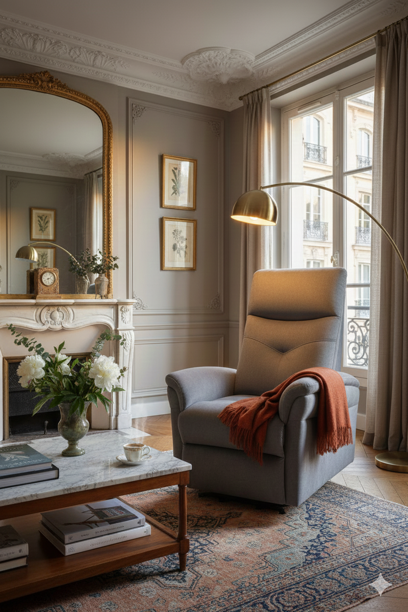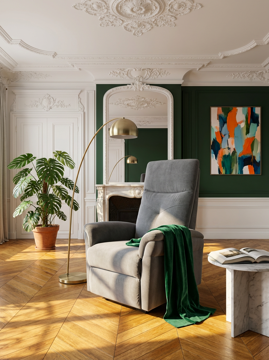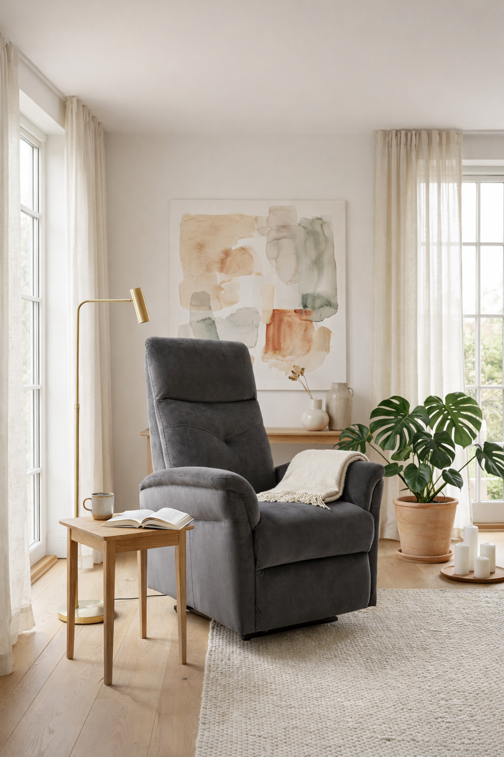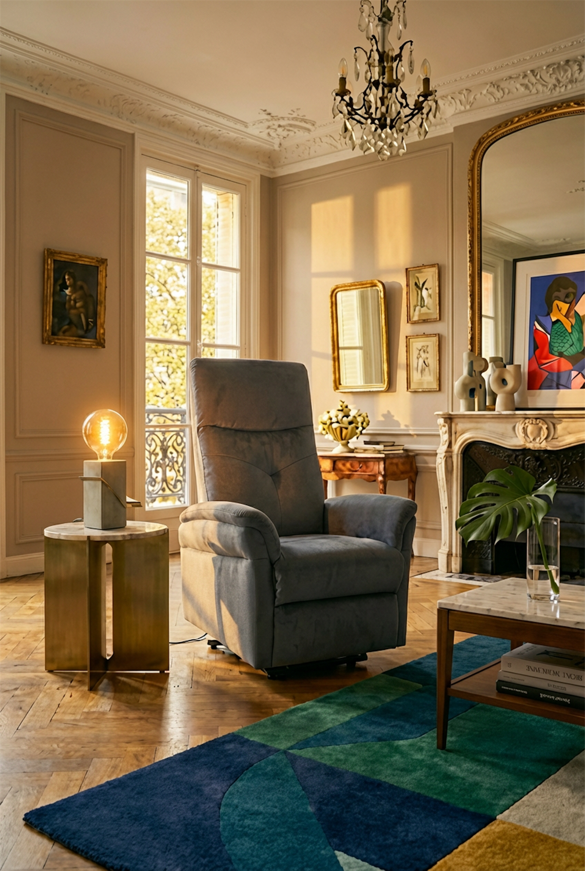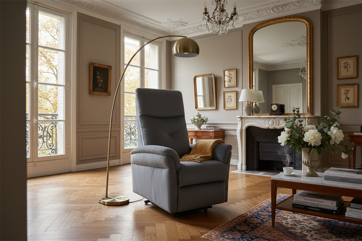 Cette option est particulièrement adaptée lorsque le fauteuil se trouve au milieu d’une pièce sans prise à proximité ou pour un fauteuil pivotant.